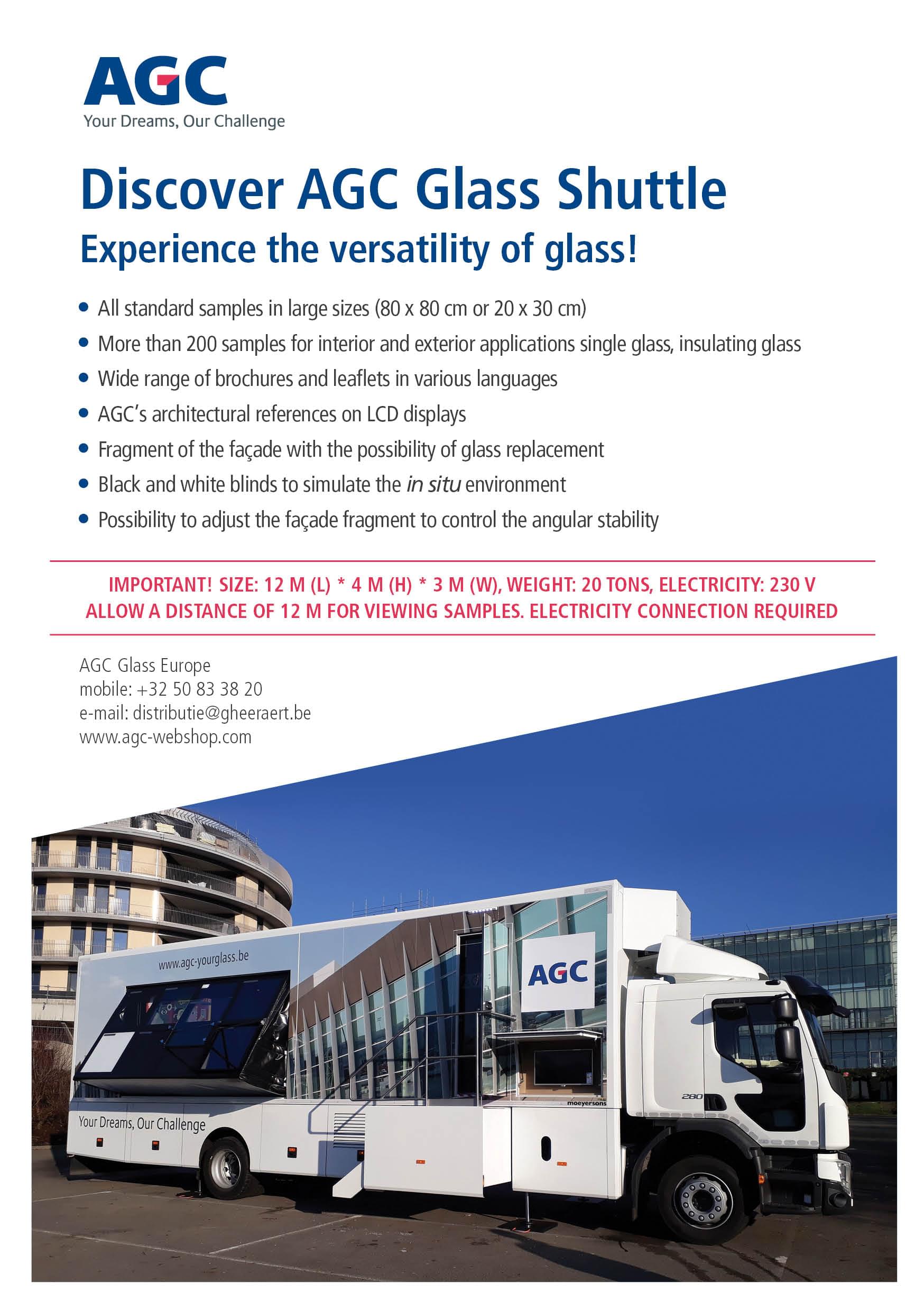 Glass Shuttle is the AGC’s promotion truck with the aim of reaching out to prospective and existing customers and decision makers throughout Western Europe to the markets and locations of your need. Give your clients an opportunity to experience AGC glass directly on their project site or during your local marketing event.